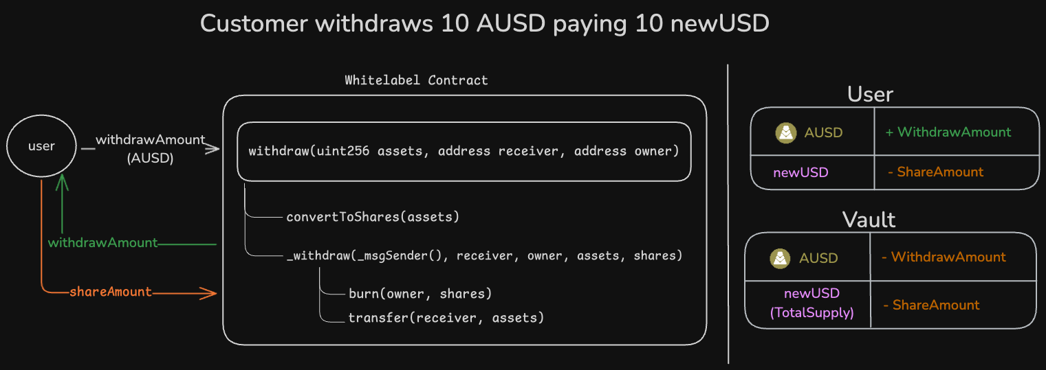 withdraw()orredeem()withdraw(assets, receiver, owner)- Specify exact AUSD amount to receive. The vault calculates and burns the corresponding newUSD.redeem(newUsd, receiver, owner)- Specify exact newUSD to burn. The vault calculates and sends the corresponding AUSD amount.